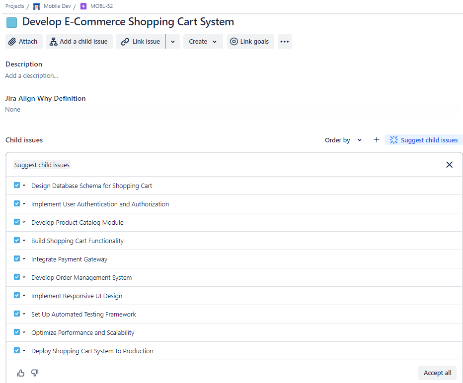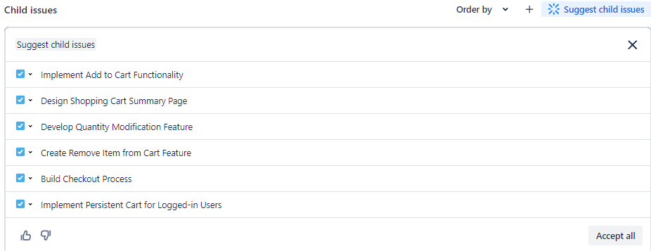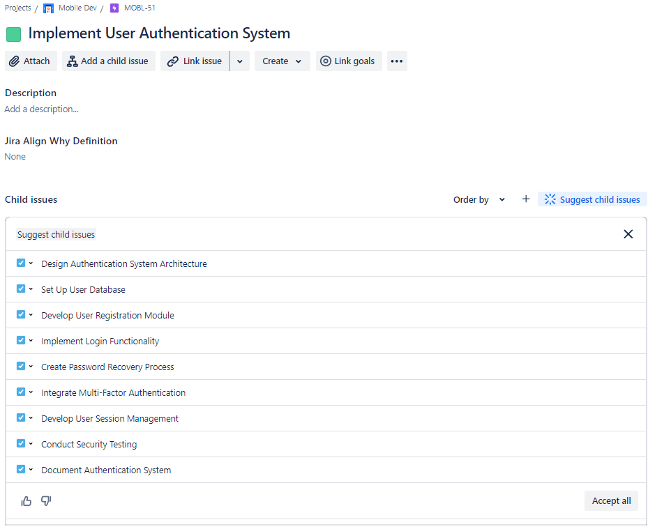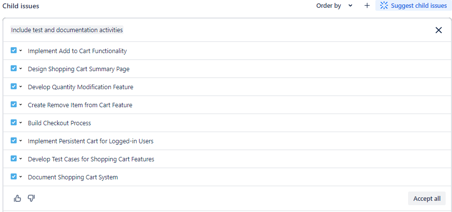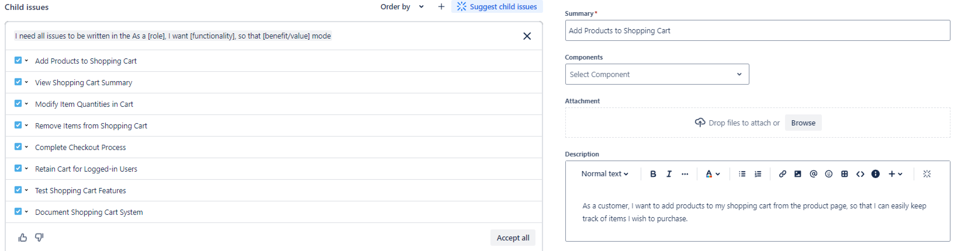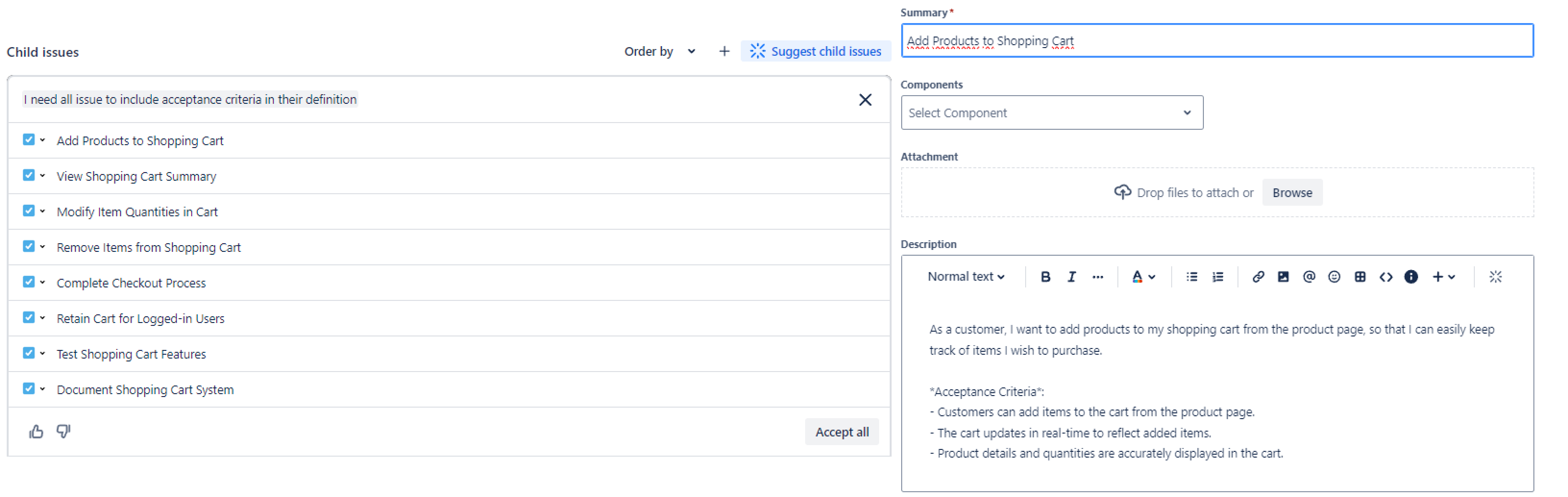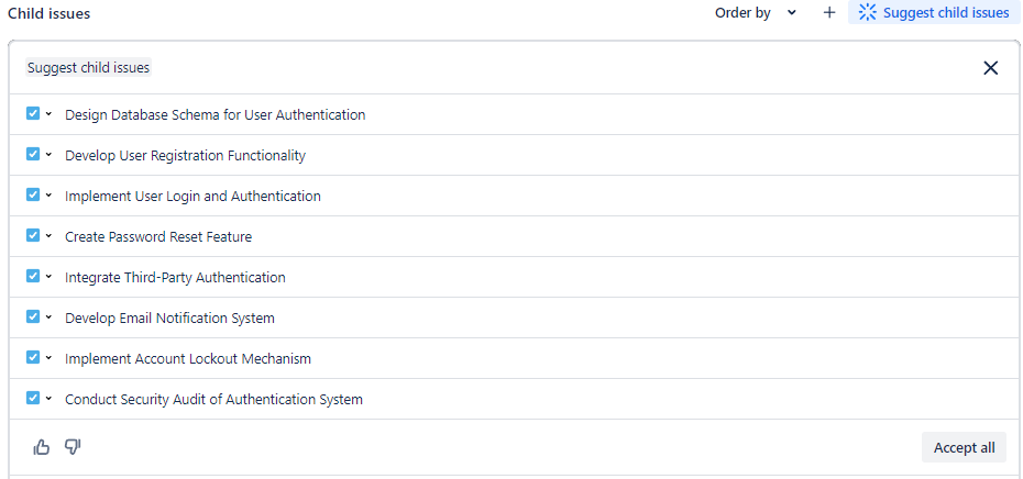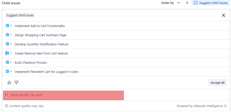 Parece que la IA de Atlassian es capaz de hacer grandes cosas en este ámbito de Work Breakdown Structure, siempre que hablemos de los campos Summary y Description. En cambio, si le pedimos que cree las issues con unas prioridades concretas o asociadas a algún componente o etiqueta, o vinculadas entre sí con enlaces, no da resultado. Aunque, como nos gusta decir… #TrustTheProcess.