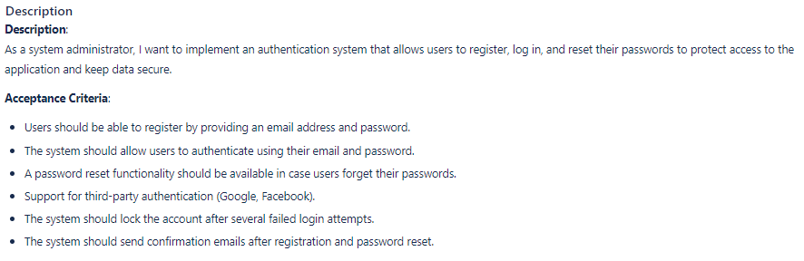 Como se puede apreciar, únicamente con un summary, la descomposición de historias de usuario cumple con bastantes de las funcionalidades que nos interesaba cubrir en esta épica (capacidad de registro de usuarios, login y reseteo de contraseña). Incluso incorpora funcionalidades que pueden ser de interés como la integración con autenticación multi-factor, o tareas relacionadas con pruebas y documentación. Vamos a ver si incorporando una descripción de la épica conseguimos que cumpla con todos nuestros requisitos.