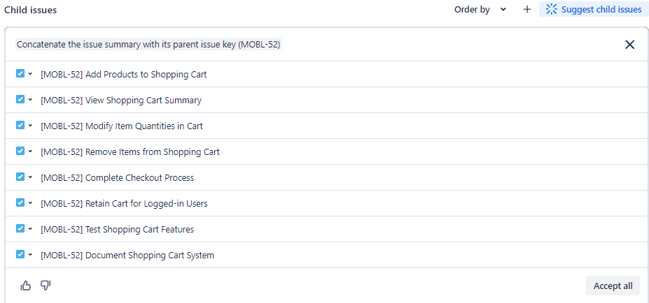 Vamos allá con el último prompt. Ahora, introduciremos “Concatenate the issue summary with its parent issue key (MOBL-52)”. Como resultado, obtenemos el summary propuesto por la IA concatenado con el ID de la épica padre. Aquí hubo que ayudar un poco a la IA agregando manualmente en el Prompt el ID a concatenar, sino no era capaz de hacerlo y se inventaba un ID.