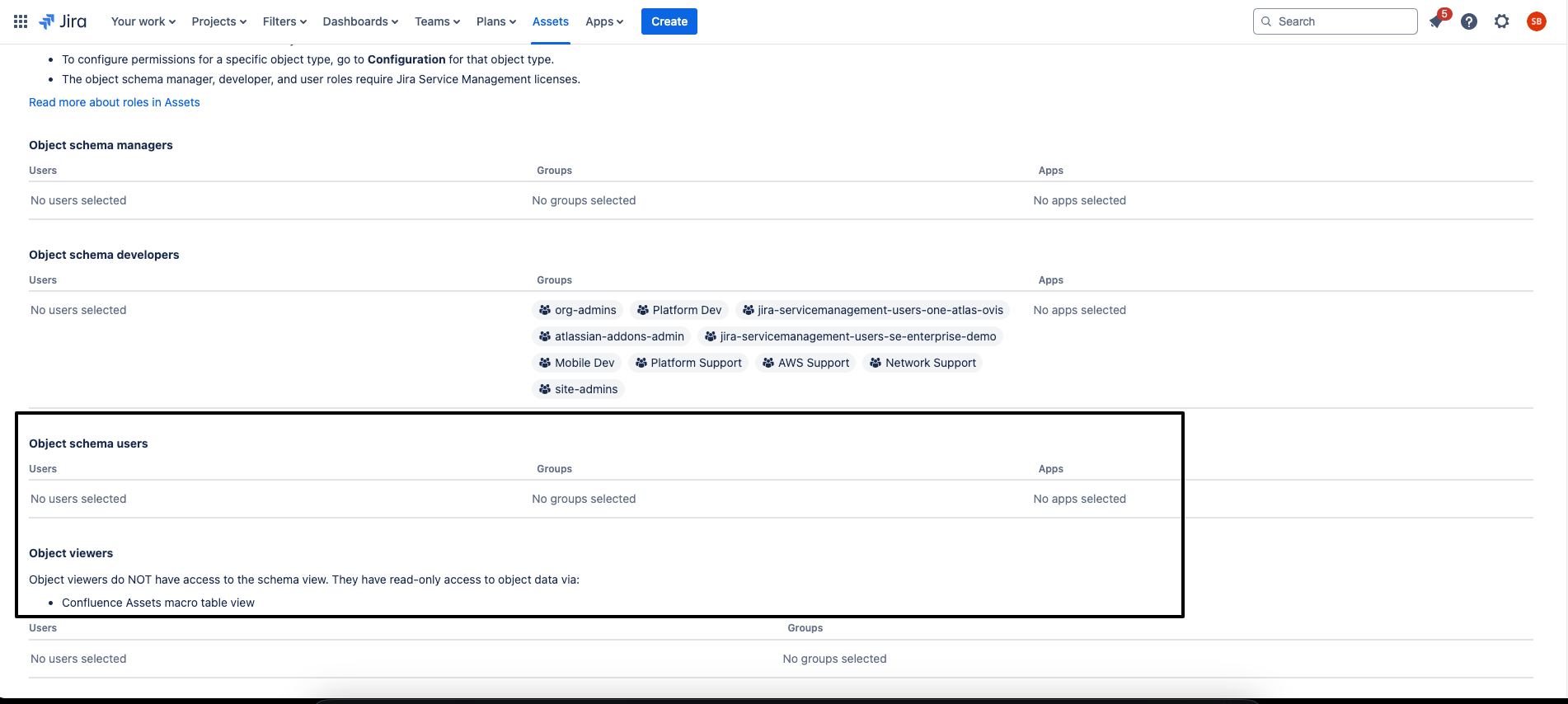 Vinculado a esta nueva funcionalidad, aparece también un nuevo rol en Assets: object viewer, dentro de la configuración del Esquema. Este rol está diseñado para aquellos que necesitan ver todos los datos de objetos dentro de un esquema de manera externa, incluso desde Confluence, pero no necesitan acceso completo a Jira Service Management.