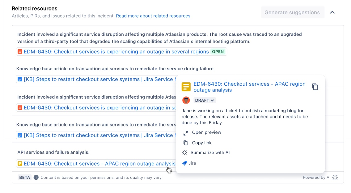 ¿Cansado de leer hilos eternos en un ticket para ponerte al día? Atlassian Intelligence genera un resumen claro de lo que ha ocurrido, ideal para escalar o retomar un incidente en curso.