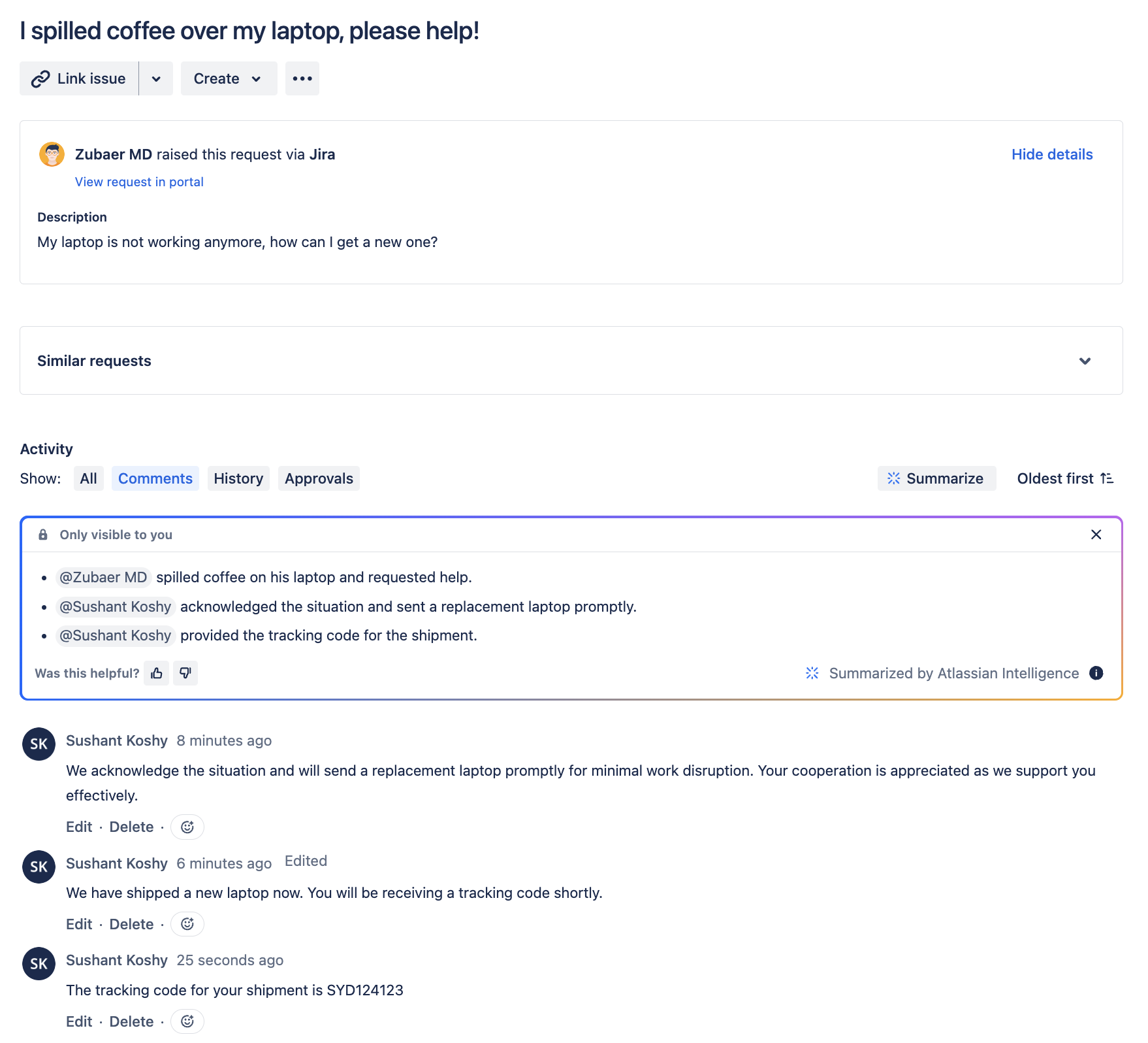 ¿No sabes si este problema ya pasó antes? ¿Quién lo resolvió? ¿Hay documentación? Atlassian Intelligence te sugiere incidencias similares, artículos de Confluence y tickets relacionados para que puedas resolver antes… y mejor.