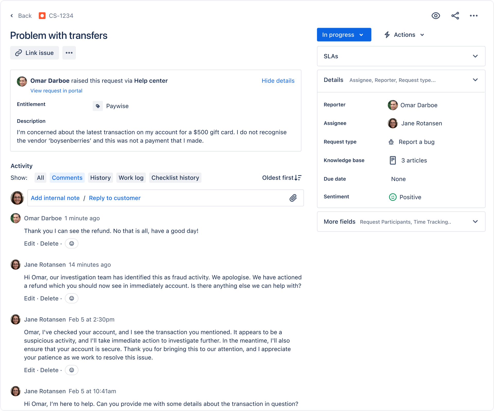 Más allá del contenido textual, Atlassian Intelligence analiza el tono emocional de los tickets para indicar el nivel de satisfacción o frustración del usuario.