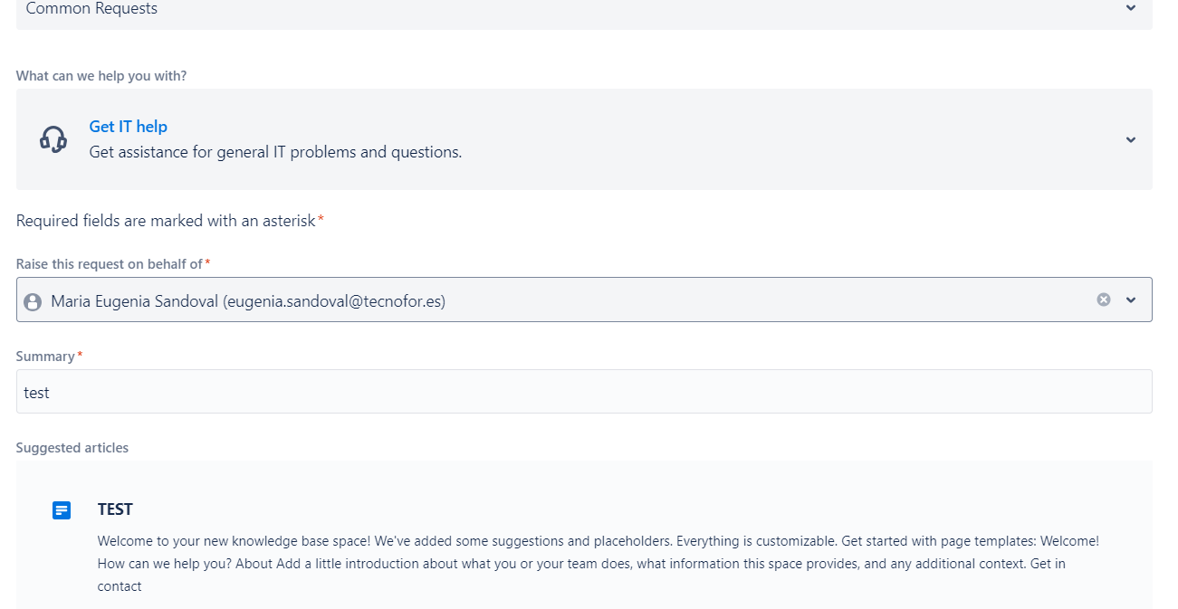 Ahora que ya hemos otorgado los permisos al único usuario de Confluence con licencia, este usuario podrá crear espacios. También gestionar sobre qué formularios del portal aparecerá este espacio de sugerencia para los usuarios finales: