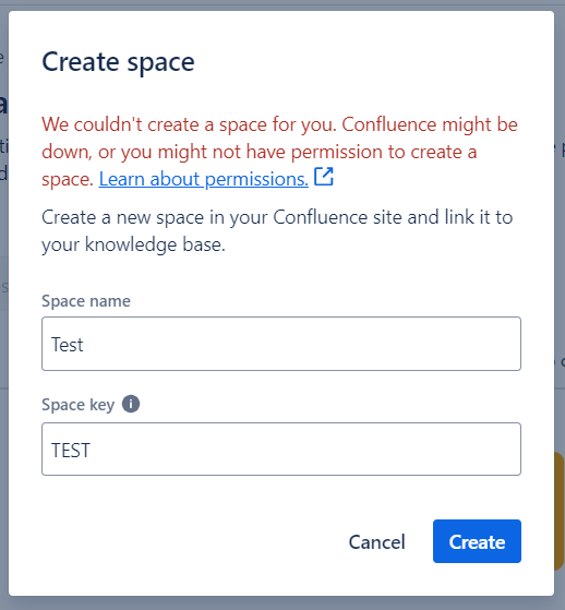 Es posible que la primera vez que intentes crear un espacio dentro de la KB, te aparezca el error que ves en la imagen de la izquierda. Esto se debe a que no tienes los permisos suficientes para crear un espacio en Confluence. Para solucionar esto, ve a la configuración del producto y gestiona los permisos necesarios para hacerlo.