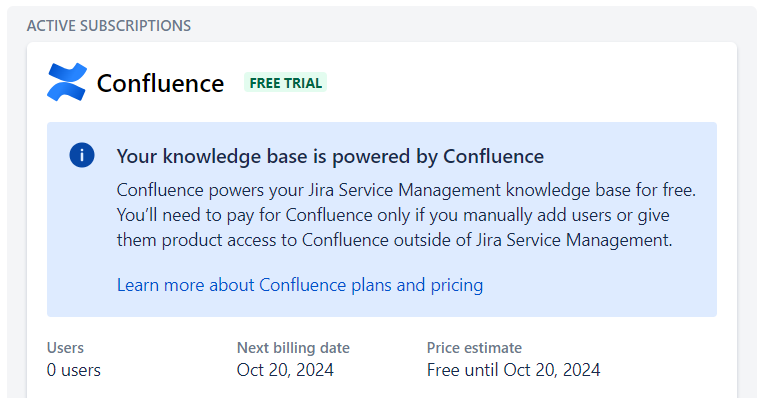 Como puedes ver a continuación, lo que se aplica en un primer lugar es el trial de Confluence con un total de 0 usuarios: