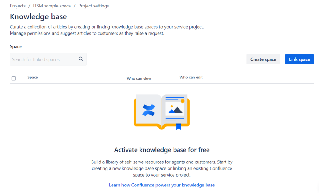 - Cuando Confluence se haya instalado correctamente, el sitio te redireccionará de nuevo a los ajustes de la Base de Conocimiento. Dentro de estos ajustes, puedes crear o linkear contenidos para que aparezcan dentro del portal, o para que sean de más fácil acceso para los agentes.