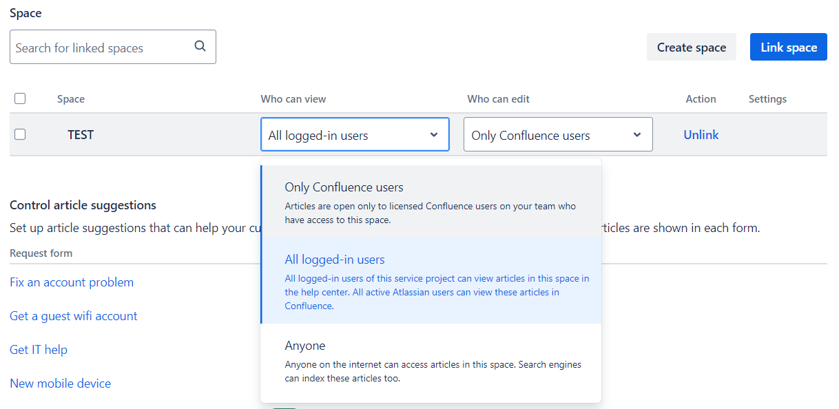 Asegúrate que tanto el acceso al espacio desde Jira Service Management, como el acceso Anónimo están habilitados con el check verde.