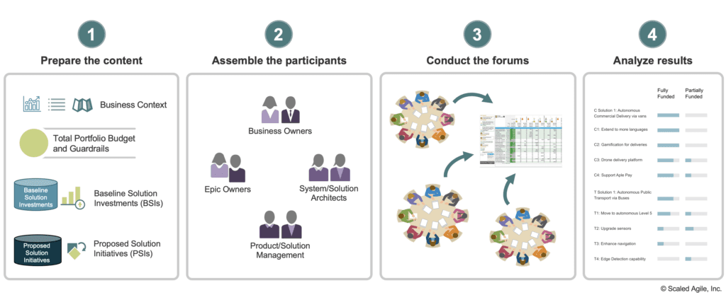 SAFe describe una forma diferente de organizar cómo se asigna el presupuesto para que una emrpesa sea capaz de sacar adelante sus nuevas iniciativas y dar soporte y mantenimiento a las actuales. Para empezar, en SAFe no se financian proyectos sino que se financia la capacidad asociada a los value streams de desarrollo. Y las decisiones de cuánto dinero se asigna a cada value stream se gestan en un proceso de financiación participativa, que consta de 4 pasos, y que finalmente es supervisada por el comité de Lean Portfolio Management. Los 4 pasos son éstos: