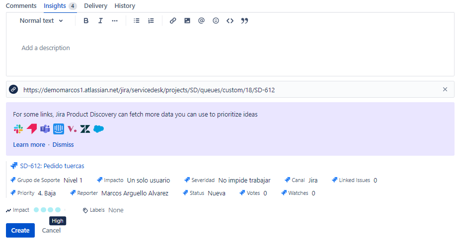 En el momento que enlacemos una url de una issue desde un proyecto service management, se visualiza la issue con diferentes campos rellenos.
