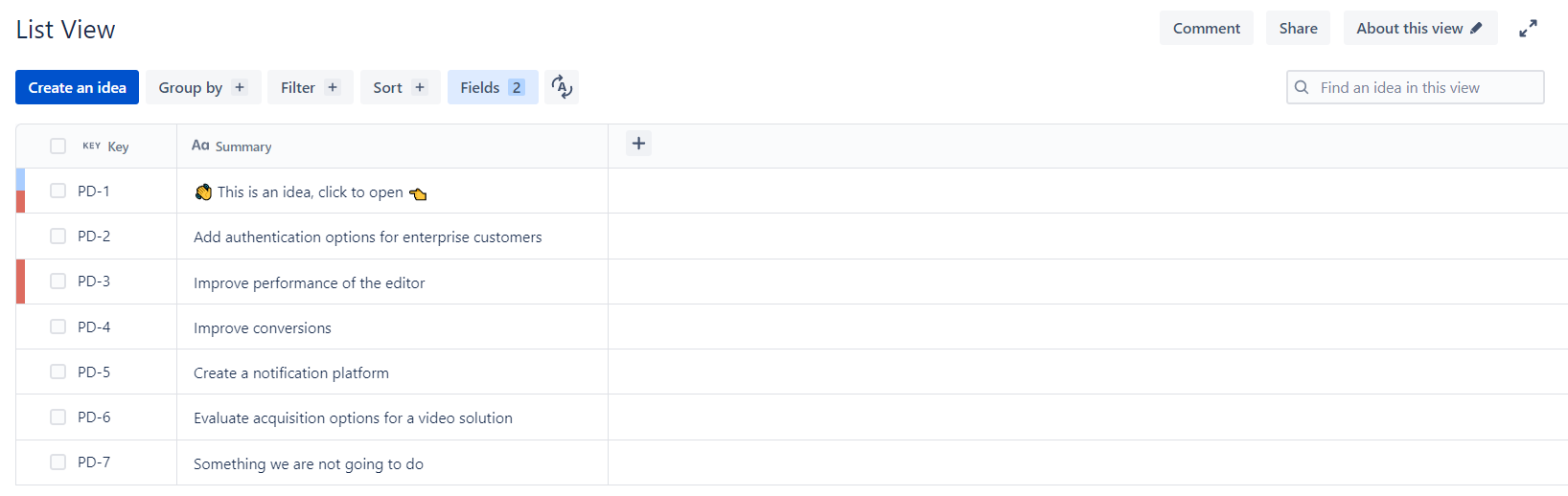 Para Jira Product Discovery una idea es una unidad de trabajo mediante la cual se pueden representar problemas, oportunidades o soluciones y es el tipo de issue que se utiliza en este nuevo proyecto.
