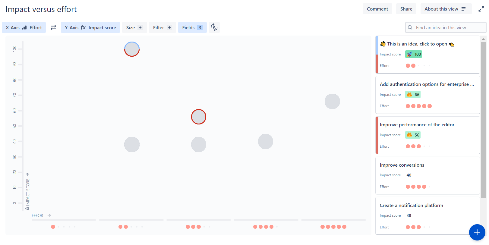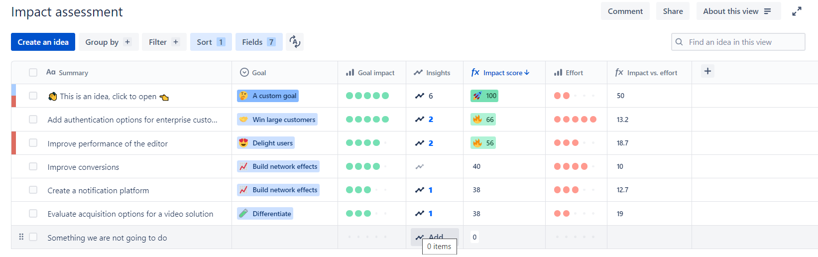 Dentro de las ideas se pueden parametrizar diferentes atributos como metas, equipos, prioridad o impacto dando al proceso una aspecto más visual, usando nuevos campos.