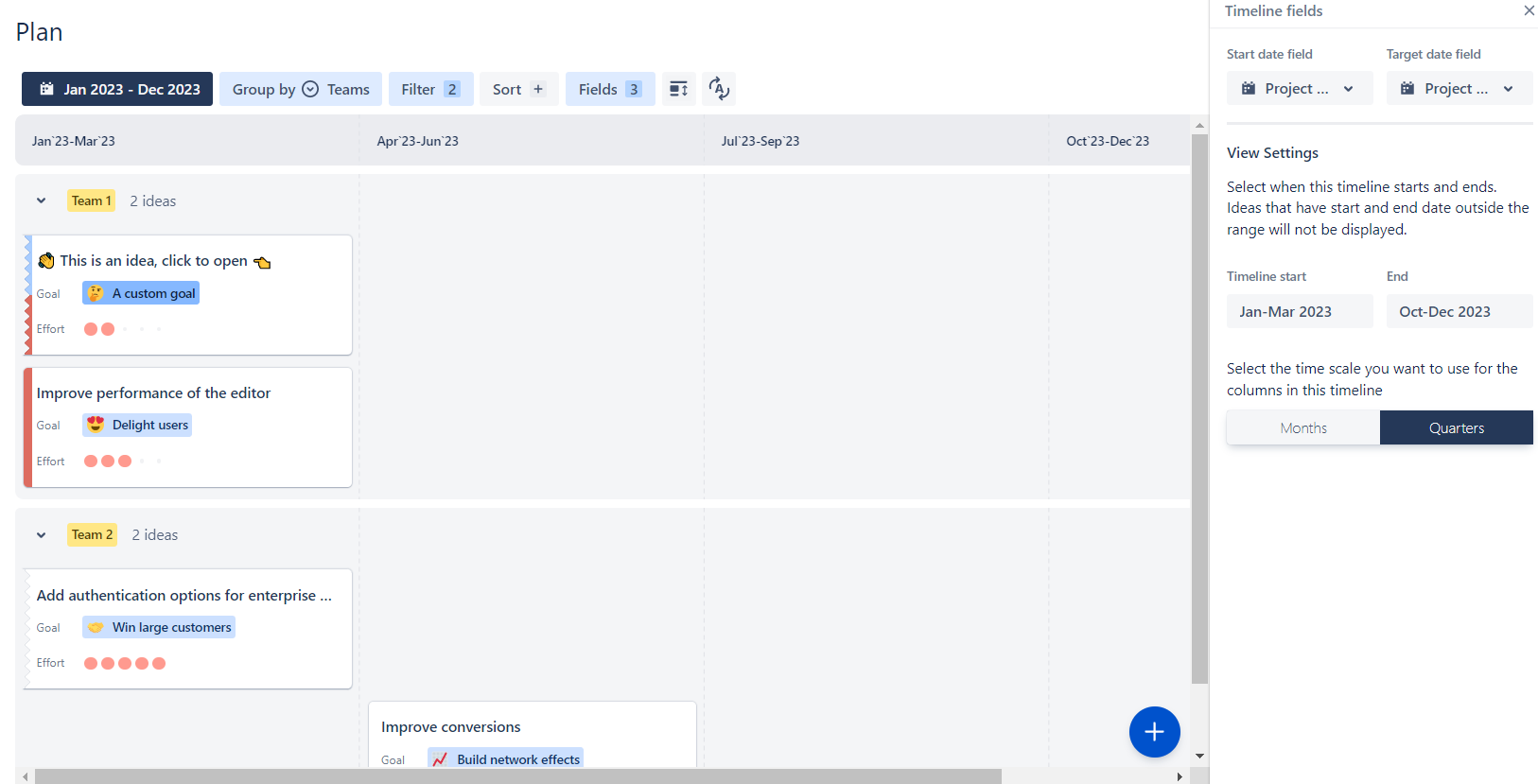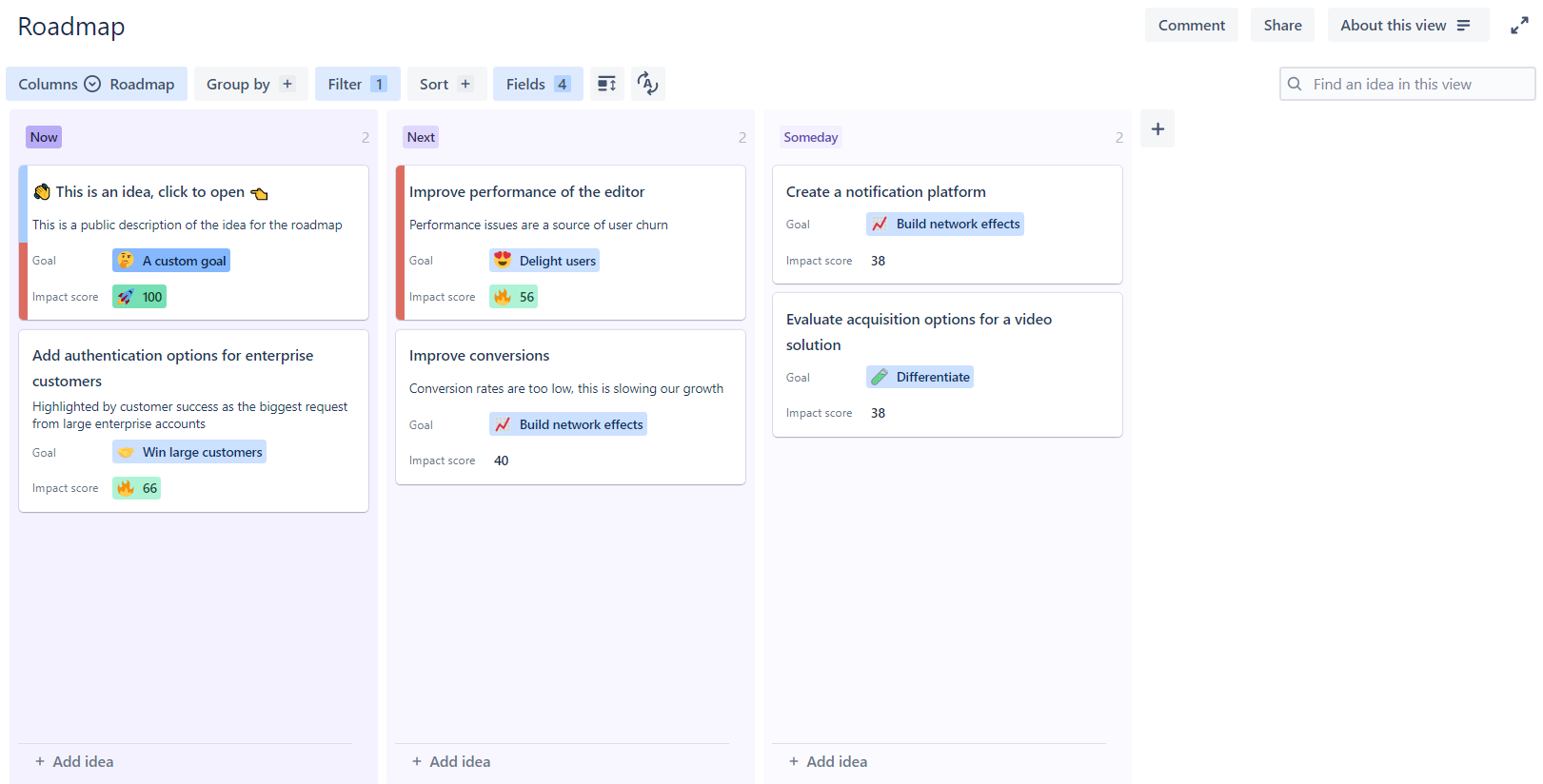 Esta vista permite visualizar las ideas en forma de roadmap pudiendo dividir las columnas por meses o por trimestres.