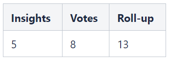 Roll-up: Es la suma de diferentes valores de campos numéricos (ej. la suma de insights y votos dentro de una idea)