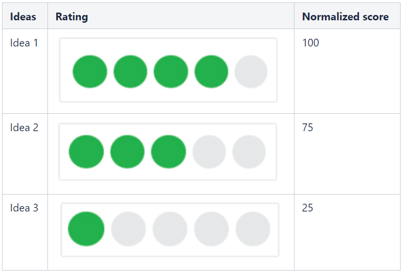 Weighted Score/Puntuación ponderada: Ayuda a entender el valor de una idea en relación a otras ideas utilizando la normalización, es decir, el peso de una idea sobre el total de las ideas.