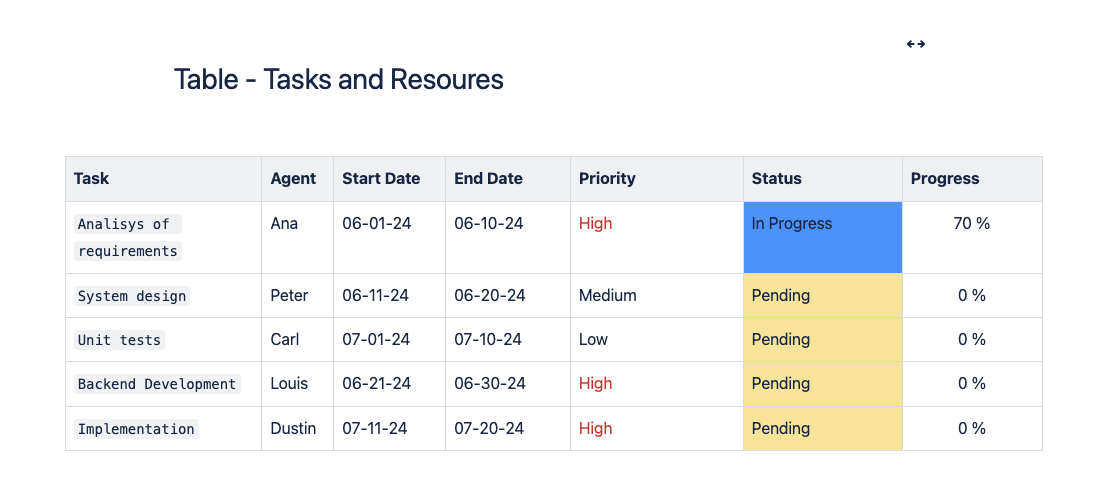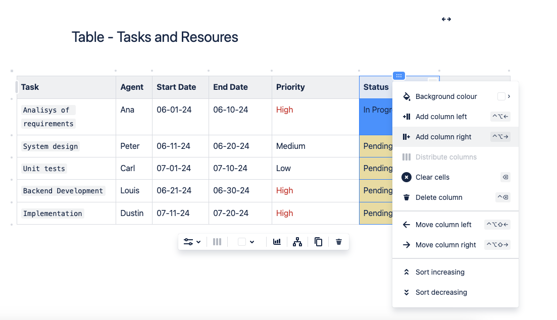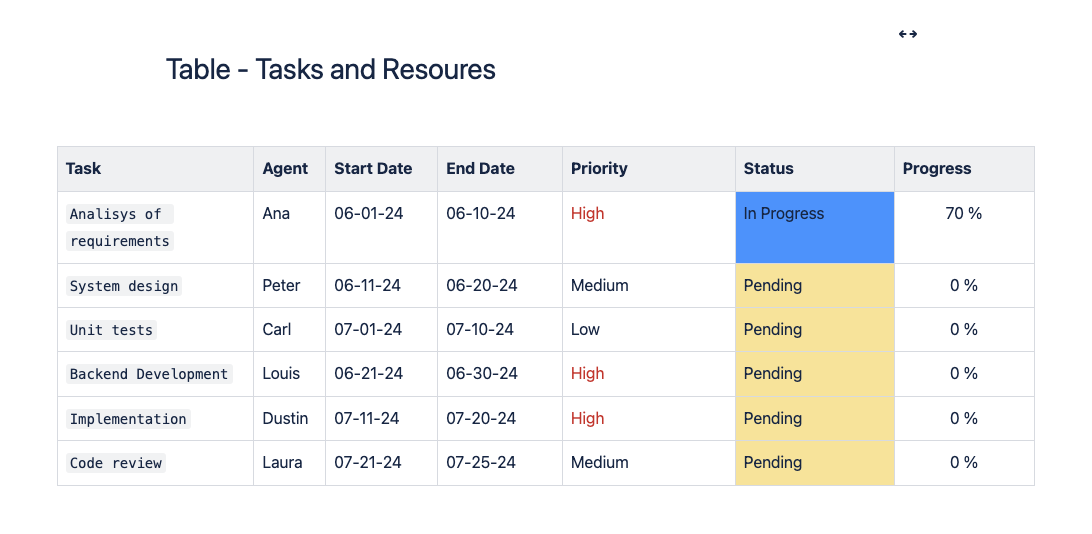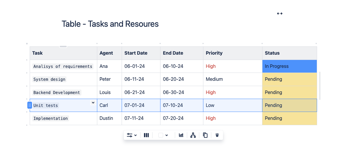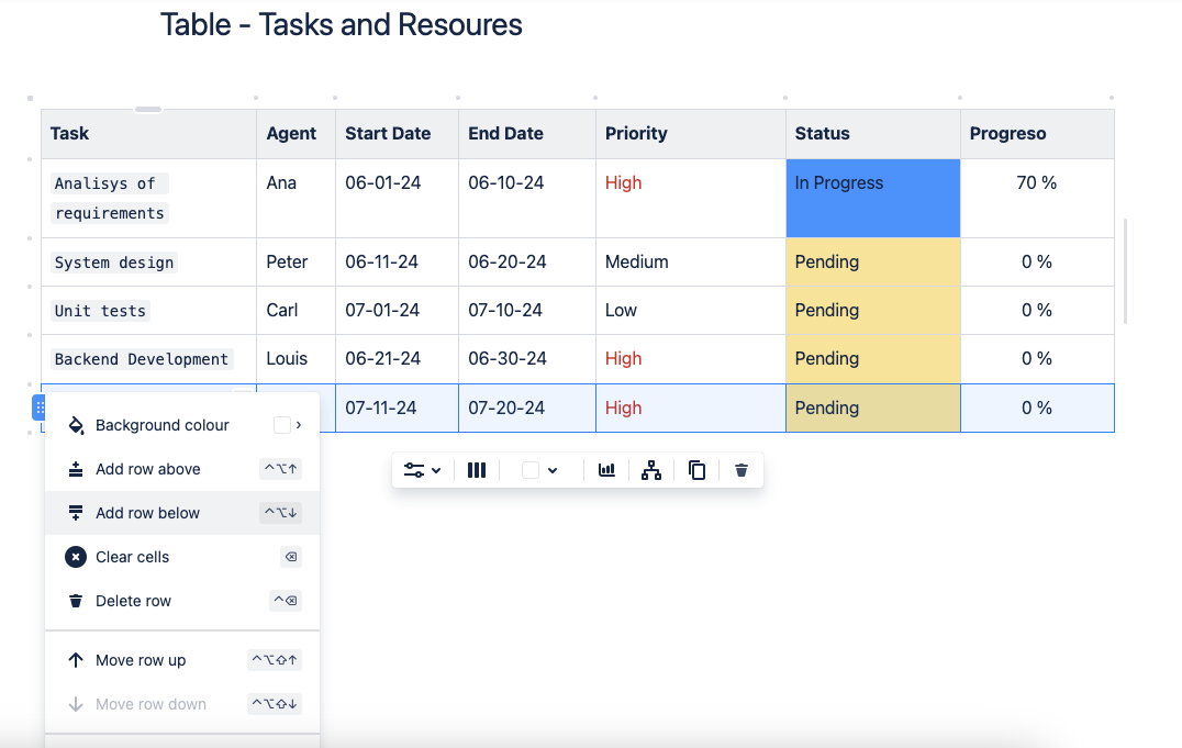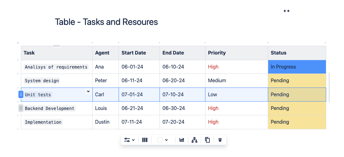 Imaginemos que estás gestionando una página en un espacio en Confluence y necesitas organizar una tabla con datos complejos sobre tareas y recursos. Supongamos que necesitas mover la tarea “Unit tests” antes de “Backend Development”.