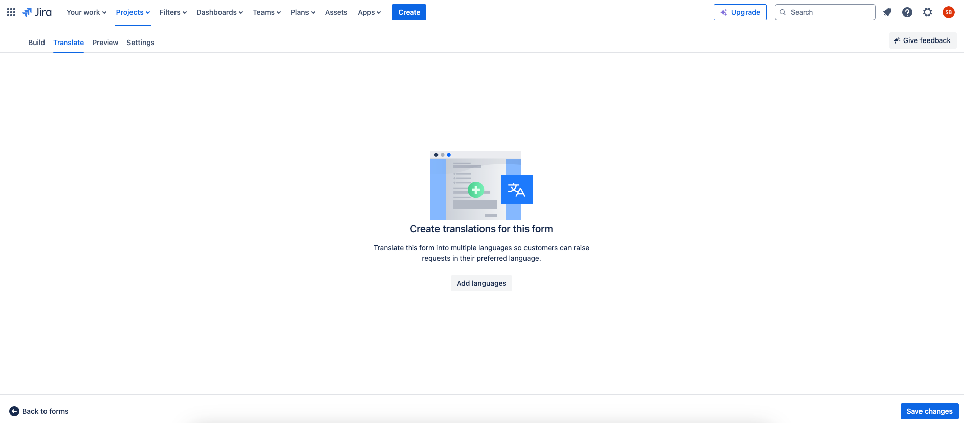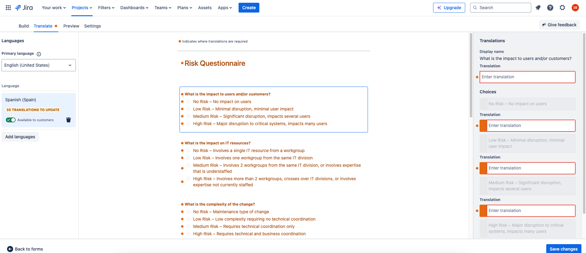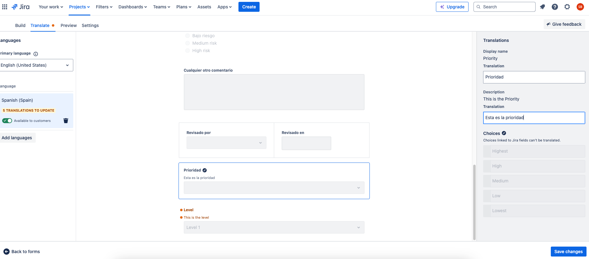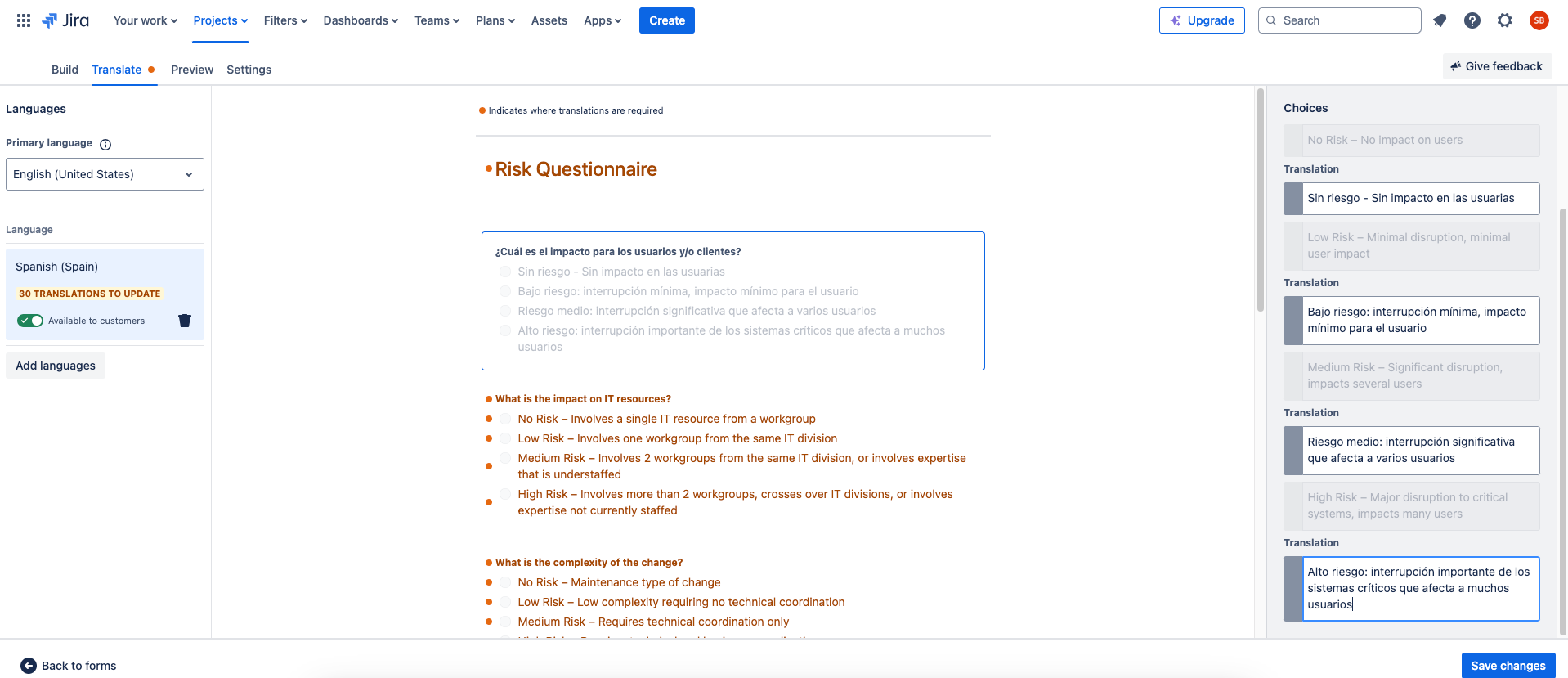 Por ahora, tenemos que hacer este proceso de forma manual. Atlassian Intelligence tiene muchas maravillas, pero todavía no incluye esta función. Otra anotación importante es que, cada vez que realices una modificación o agregues nuevos datos/campos al formulario original, tienes que traducir de forma manual en tantas traducciones como tengas. El sistema te notifica mediante un icono naranja orange circle al lado de “Translate” indicando que hay traducciones pendientes.
