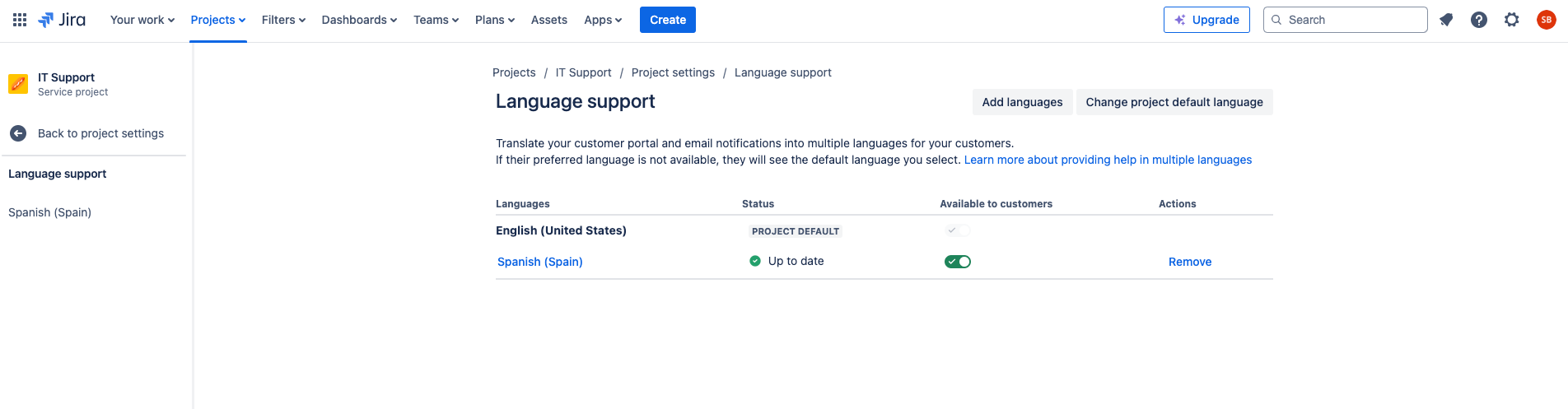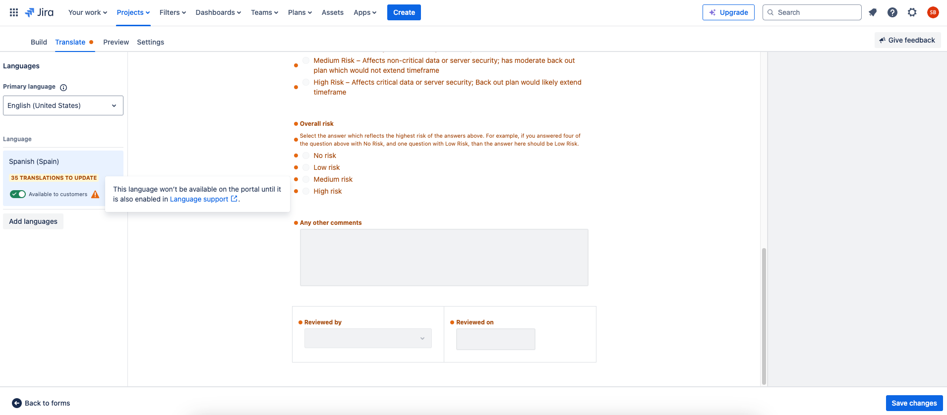Una vez hayas seleccionado el nuevo idioma, el formulario te indicará aquellas secciones que necesitan traducción. Esto facilita enormemente la labor de incluir aquellos textos que sean necesarios. Al habilitar el idioma, Jira nos indicará si ese idioma está disponible también en el portal. Esto es importante, porque como comentábamos, el proyecto también debe tener incluida esta traducción.