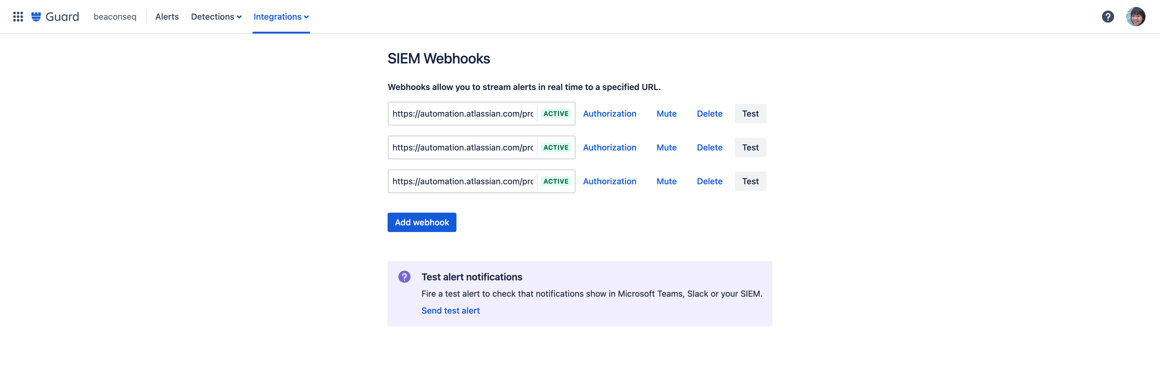 Con webhooks, puedes enviar alertas sobre actividades anómalas a cualquier destino, incluido el SIEM de toda la organización o una herramienta de automatización como automatización de Jira, Zapier o Workato.